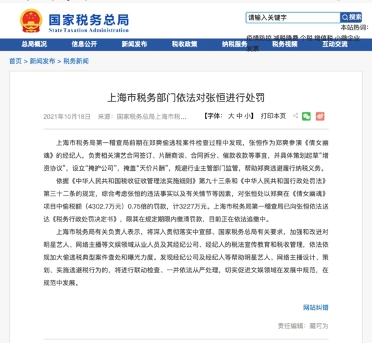 依据《中华人民共和国税收征收管理法实施细则》第九十三条和《中华人民共和国行政处罚法》第三十二条的规定,综合考虑张恒的违法事实以及有关情节等因素,对张恒处以郑爽在《倩女幽魂》项目中偷税额(4302.7万元)0.75倍的罚款,计3227万元。上海市税务局第一稽查局已向张恒依法送达《税务行政处罚决定书》,限其在规定期限内缴清罚款,目前正在依法追缴中。