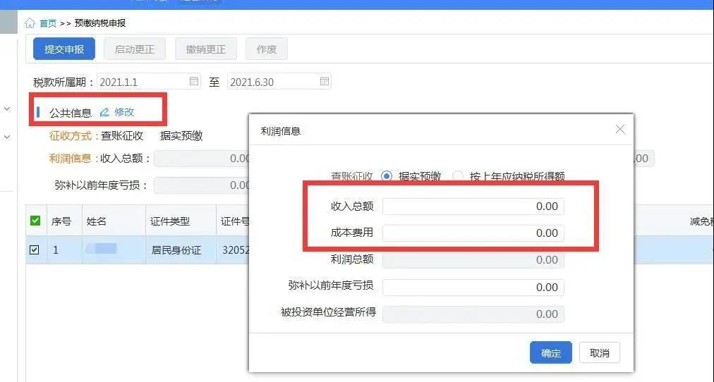 公共信息在税款所属期的下面,点击修改,即可填写收入、成本等信息啦。