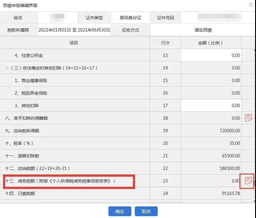 1. 点击“减免税额”右侧“小红笔”图标进入到附表界面,“减免事项”、“减免性质”分别选择“个体工商户减半征收经营所得个人所得税”、“个体工商户减半征收经营所得个人所得税”,系统自动计算出“减免税额”。(若还有其他的减免,也需据实填写)