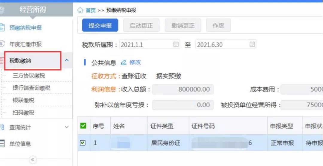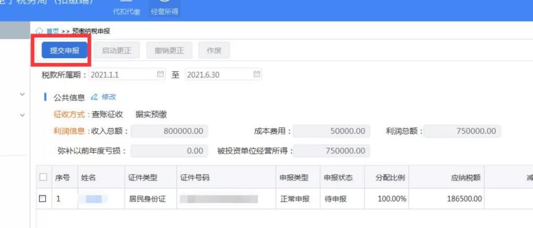 2. 确定之后回到申报模块,此时会发现,预缴纳税申报模块下有“提交申报“按钮。