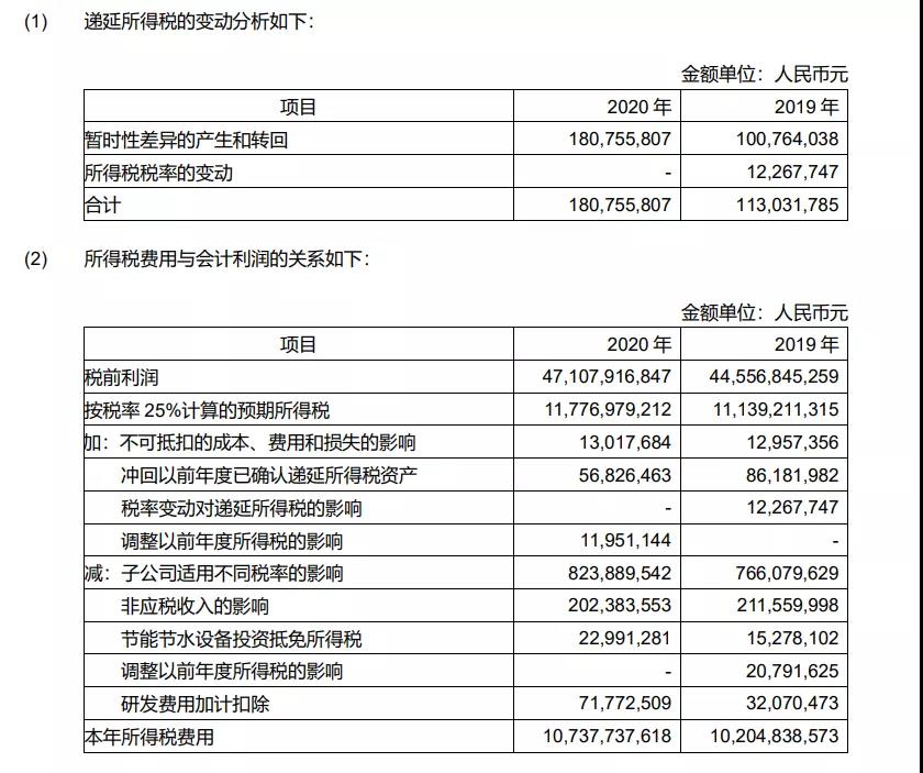 举一个例子。某上市公司2020年合并利润表中的本期所得税费用为10,737,737,618元,而年报中披露的本期企业所得税为10,545,030,667元,本期的所得税费用与按税法及相关规定计算的当年所得税,两者差额192,706,951元。是什么原因造成这么大差异呢?