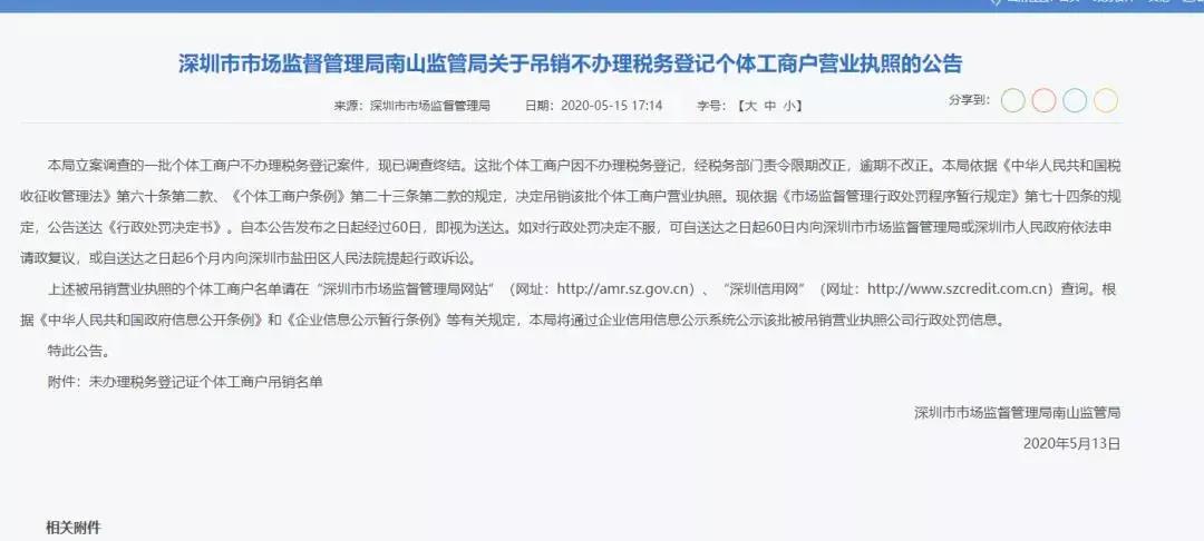 去年,深圳市场监督管理局发布行政处罚,已有一万多家个体户因不办理税务登记且逾期不改,被吊销营业执照。
