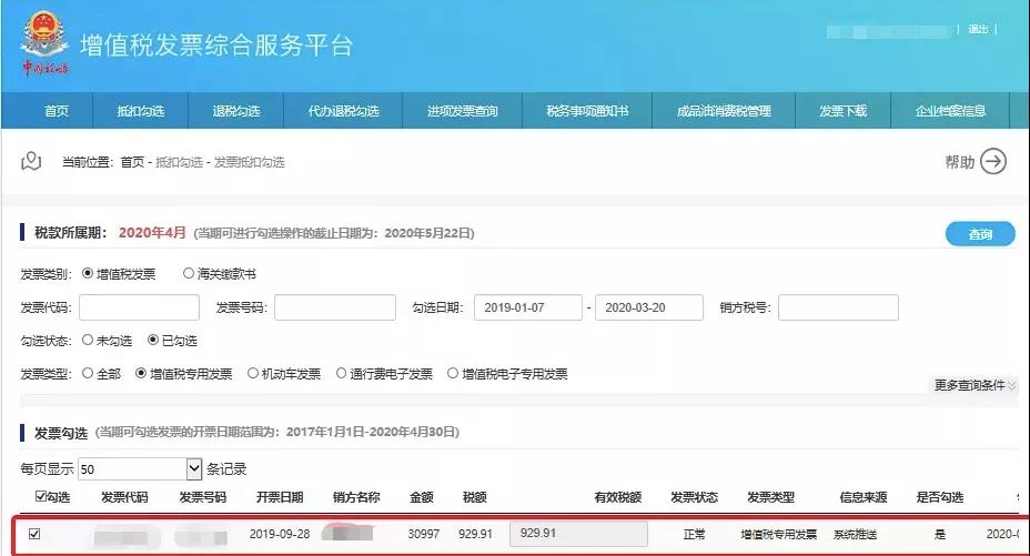 2、查询相应发票的电子信息,完成勾选、提交、确认。