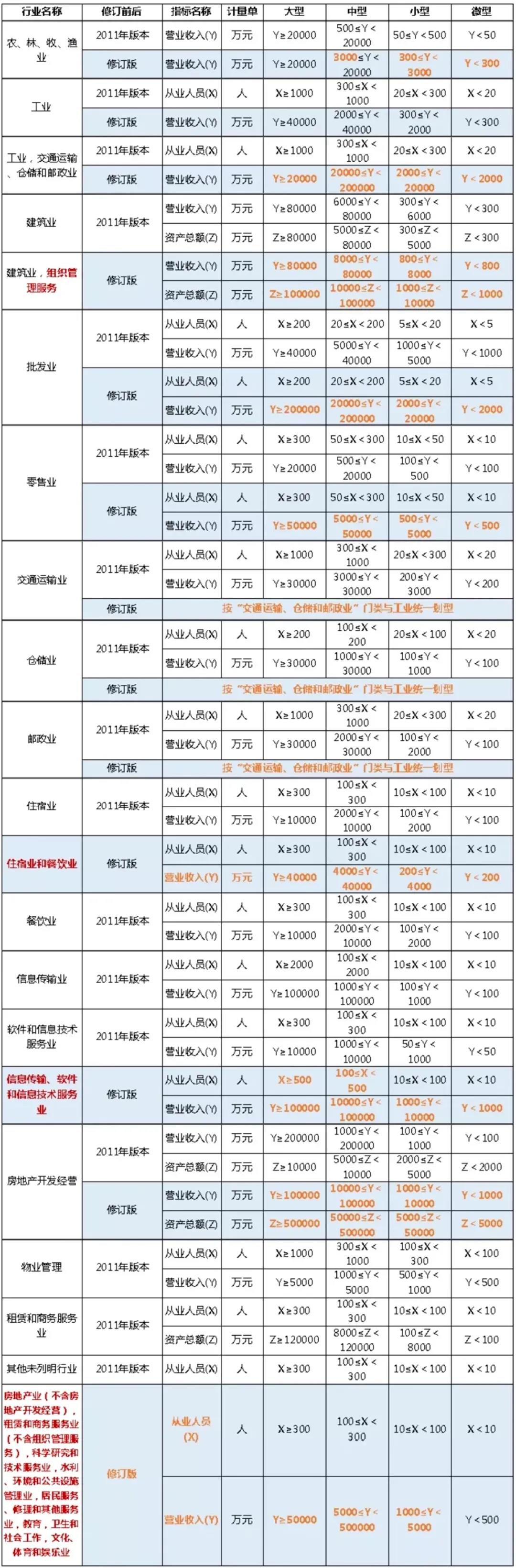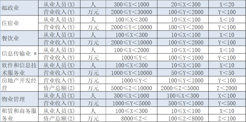 将住宿业、餐饮业合并,按“住宿和餐饮业”门类统一划型;将信息传输业、软件和信息技术服务业合并,按“信息传输、软件和信息技术服务业”门类统一划型;将交通运输业、仓储业、邮政业合并,按“交通运输、仓储和邮政业”门类与工业统一划型。