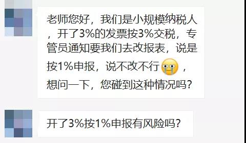 近日关于小规模3%能不能按3%交税的讨论沸沸扬扬,小编也收到留言:小规模开3%按3%交税,专管员通知:必须整改!